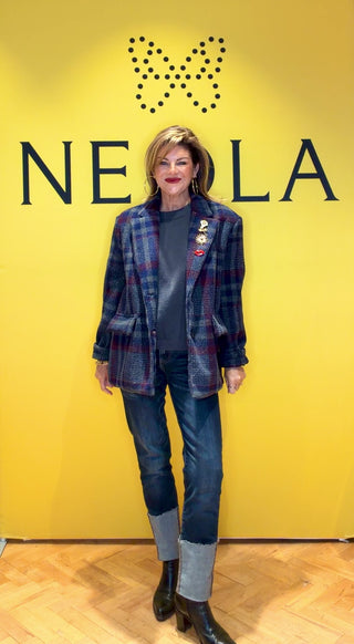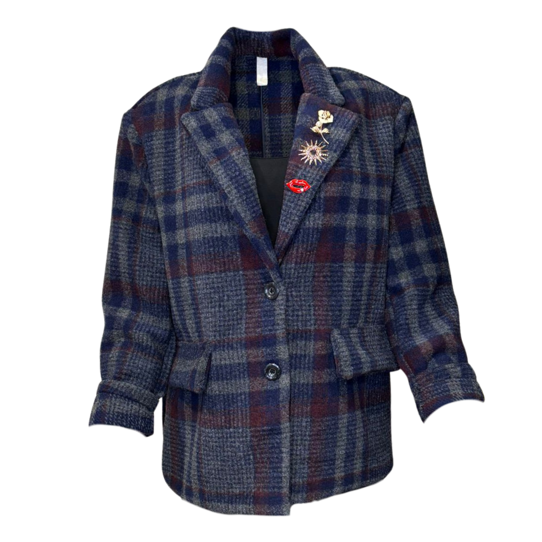 A stunning navy tartan blazer with hints of green and red—an edgy, modern twist on a timeless classic. Crafted from a comfortable wool material, it delivers both coolness and effortless wear. Finished with super-trendy, quirky pins for added personality and a sleek button closure, this blazer brings comfort, character, and standout style to any outfit