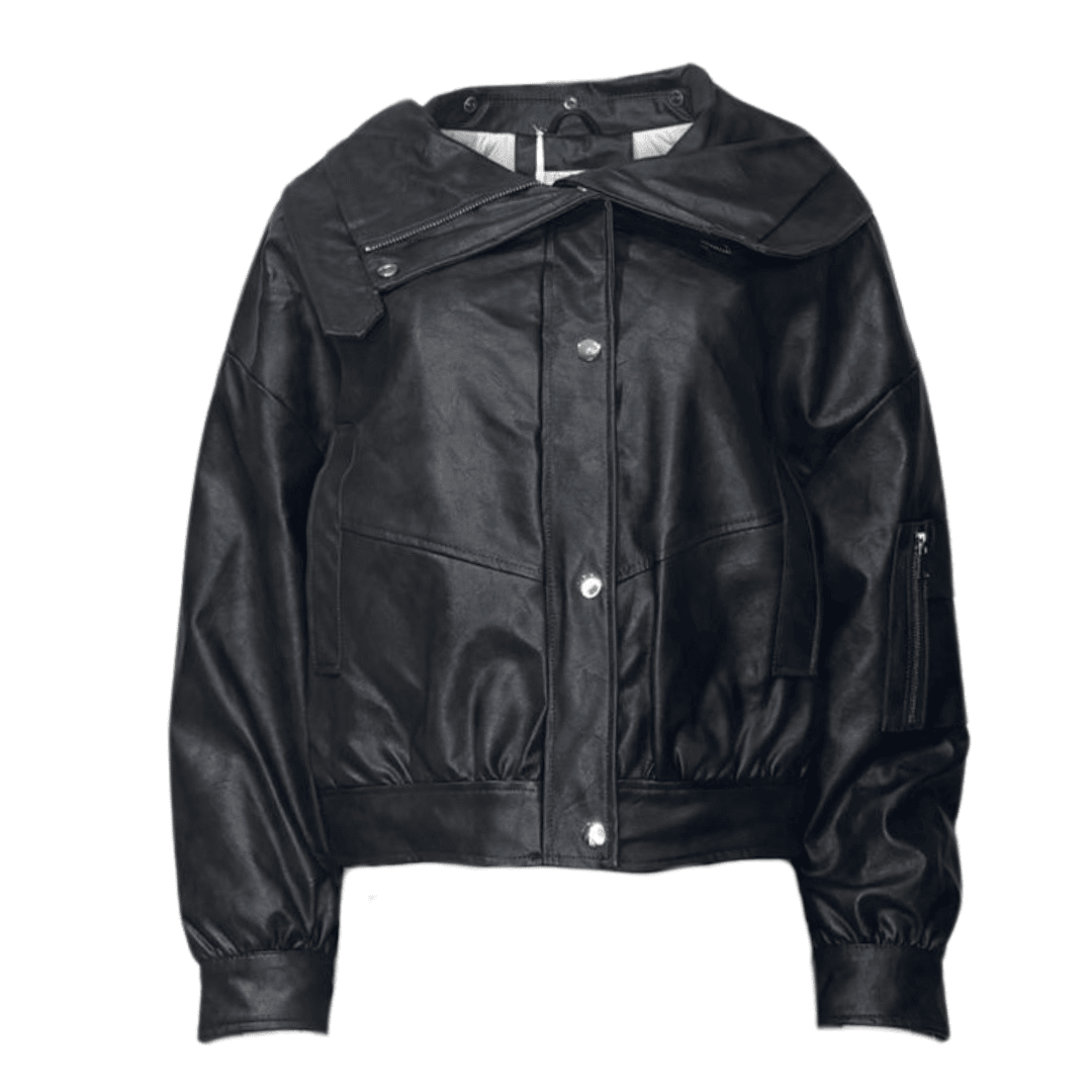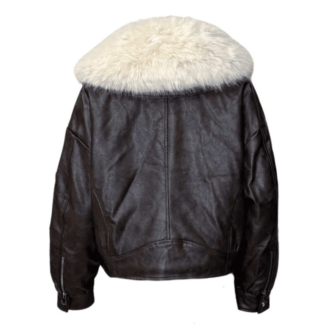 Removable fur collar bomber jacket. Multiple ways to wear, perfect layering piece, and sure to be a staple in your wardrobe. Elasticated waist and cuffs. Zip closure with buttons. Removable fur collar. Brown chocolate coloured leather with a cream coloured knit.